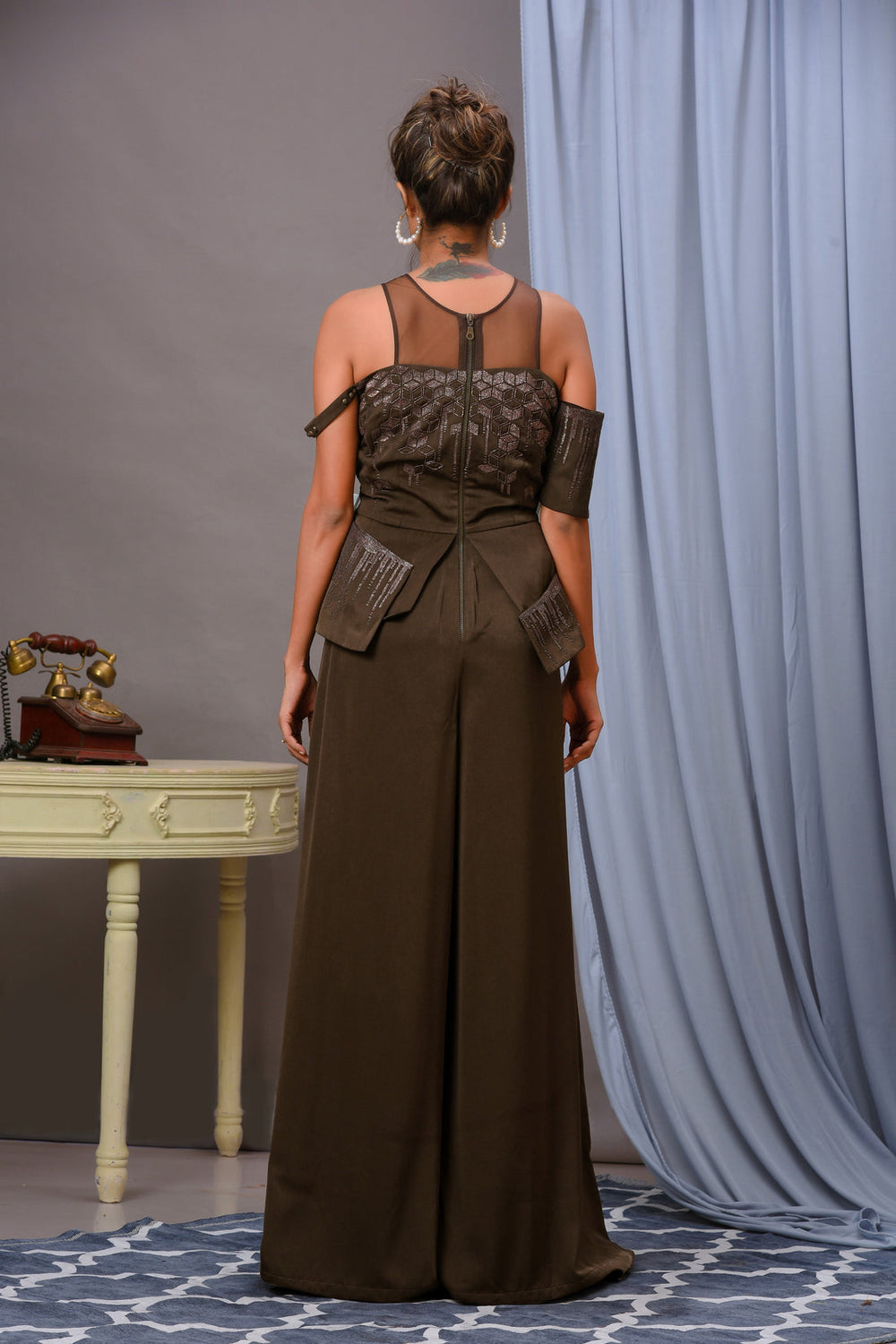 Vivek Kumar presents this stunning olive green satin jumpsuit with wide-leg bottoms, featuring exquisite cutdana embroidery on the yoke and sleeves, along with sheer net neck. The unique sleeve pattern adds intricate detail, making a bold statement that elevates the entire garment.