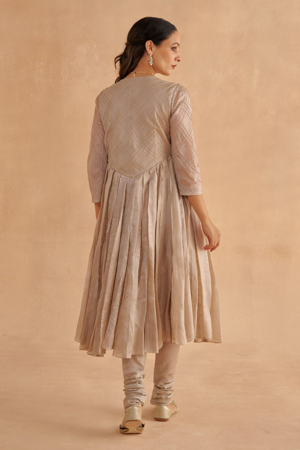 This statement Kalidar kurta in warm Paper Tussar features a V-neckline and a flattering A-line silhouette with pleats from the yoke. The kurta is adorned with pin-tuck checks and small embroidered motifs on the body and sleeves, while chintz-inspired "bels" with zardozi work add a touch of elegance. Paired with elegant churidar pants in warm grey Chanderi silk, the clean design offers comfort and style. Snap buttons at the hem add a practical yet stylish detail. The look is completed by a warm grey dupatta that features a combination of solid and block-printed organza panels. The contrast between the textures adds subtle visual play, making the dupatta a versatile addition to any wardrobe.
